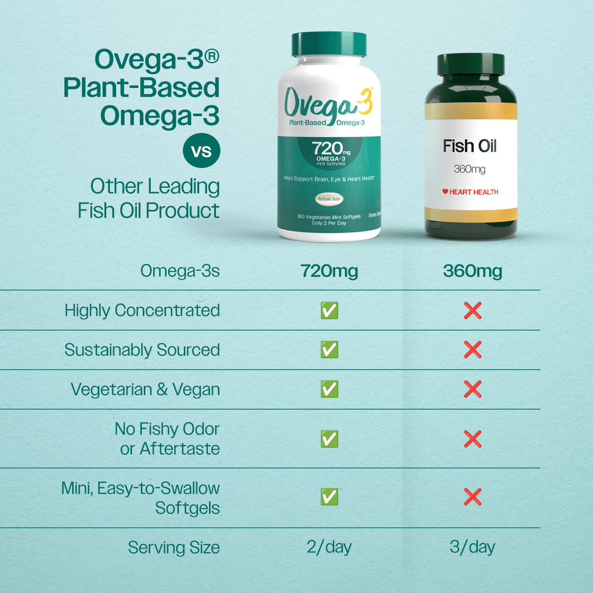 - As a sustainable alternative to fish oil, Ovega-3® supplements are made from a sustainable plant source (algae) that delivers a high concentration of omega-3s including at least 420mg of DHA & 140mg of EPA per serving.*