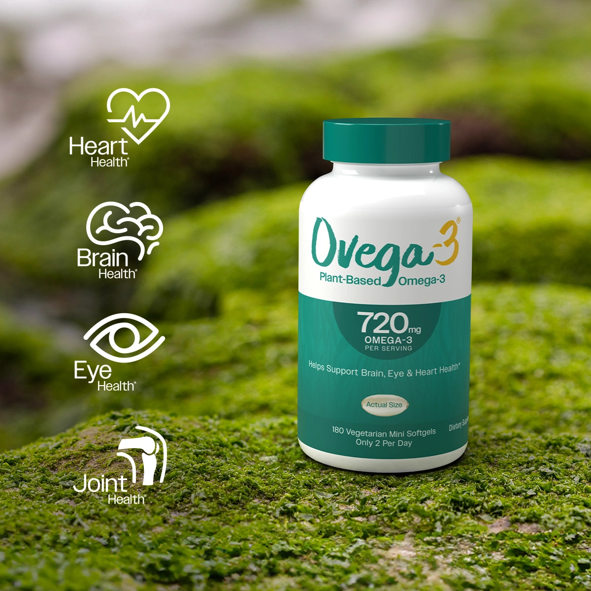 Ovega-3® softgels are a sustainably plant-based supplement which provides support to for an individual’s heart, brain and eye health. With 720mg of omega-3s, Ovega-3® softgels provide the same heart-healthy benefits of traditional omega-3 supplements and oils but without the unpleasant fishy aftertaste and impurities associated with some omega-3 fish oils.